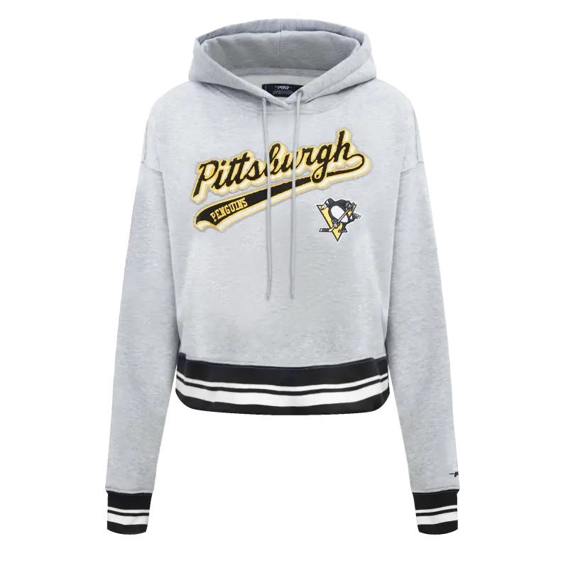 NHL PITTSBURGH PENGUINS SCRIPT TAIL WOMEN’S RIB FLEECE CROPPED PULLOVER HOODIE (HEATHER GRAY\/BLACK)